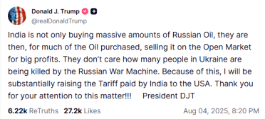 “भारत रशियाकडून फक्त तेल आयातच करत नाही, तर त्या तेलाचा मोठा भाग खुल्या बाजारात विकून मोठा नफादेखील कमावत आहे. रशियाच्या युद्धनीतीमुळे युक्रेनमध्ये किती लोक मारले जात आहेत याची भारताला अजिबात फिकीर नाही. त्यामुळे मी भारताकडून अमेरिकेला दिल्या जाणाऱ्या टॅरिफमध्ये वाढ करत आहे”, असं ट्रम्प यांनी या पोस्टमध्ये म्हटलं आहे.