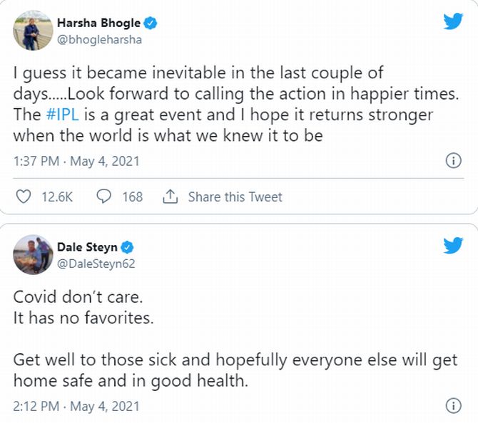 चेन्नईचे गोलंदाज प्रशिक्षक एल बालाजी यांना करोनाची लागण झाल्यानंतर बुधवारी चेन्नई आणि राजस्थानचा सामना पुढे ढकलावा लागला. त्यानंतर बीसीसीआयकडून आय़पीएल स्पर्धा रद्द करण्याचा निर्णय घेण्यात आला. सोमवारी कोलकाताचे खेळाडू संदीप वॉरियर आणि वरुण चक्रवर्ती पॉझिटिव्ह आढळल्यानंतर कोलकाचा आणि बंगळुरुमधील सामना पुढे ढकलावा लागला होता. त्यातच मंगळवारी हैदराबादचा वृद्धिमान साहा यालाही करोना असल्याचं निष्पन्न झालं.
