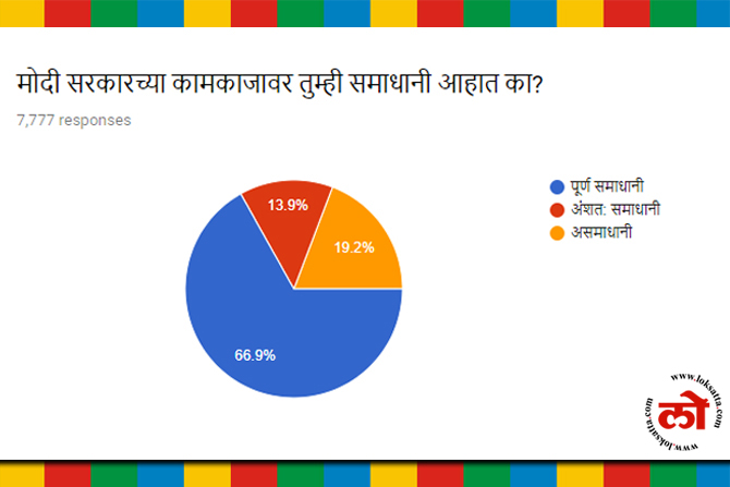 या सर्वेक्षणामधून वाचकांनी आपण मोदी सरकारच्या कामावरही समाधानी असल्याचे मत नोंदवले आहे. ५,२०१ जणांनी आपण मोदी सरकारच्या कामाबद्दल ‘पूर्णपणे समाधानी’ असल्याचे मत नोंदवले आहे. मोदी सरकारच्या कामाबद्दल समाधान व्यक्त करणाऱ्या वाचकांची टक्केवारी ६६.९ इतकी आहे. तर दुसरीकडे १९.२ टक्के म्हणजेच १ हजार ४९३ वाचकांनी मोदी सरकारच्या कामासंदर्भात आपण ‘असमाधानी’ असल्याचे सांगितले आहे. सध्याच्या सरकारच्या कामाबद्दल ‘अंशत: समाधान’ व्यक्त करणाऱ्या वाचकांची संख्या १ हजार ८३ म्हणजेच १३.९ टक्के इतकी आहे.
