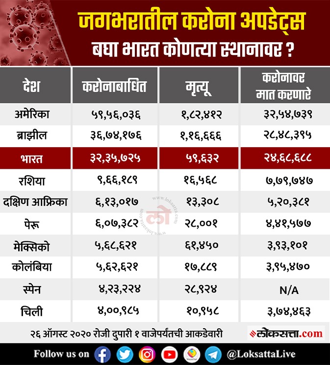 करोनाबाधितांची सर्वाधिक संख्या अमेरिकेमध्ये आहे. त्या खालोखाल ब्राझील, भारत आणि रशियाचा क्रमांक लागतो. याच यादीमध्ये दक्षिण आफ्रिका पाचव्या, पेरु सहाव्या, मेक्सिको सातव्या, कोलंबिया आठव्या, स्पेन नवव्या आणि चिली दहाव्या स्थानी आहे. पाचव्या क्रमाकांवर असणाऱ्या दक्षिण आफ्रिकेतील करोनाबाधितांची संख्या सहा लाख १३ लाखांच्या आसपास आहे. म्हणजेच जगामध्ये सर्वाधिक करोनाबाधित असणाऱ्या अव्वल दहा देशांपैकी सहा देशांमध्ये महाराष्ट्रापेक्षा कमी करोनाबाधित आहेत. सर्वाधिक करोनाबाधित रुग्ण असणाऱ्या देशांच्या यादीमध्ये महाराष्ट्राचा समावेश केल्यास सर्वाधिक करोनाबाधित असणारा तो पाचव्या क्रमांकाचा प्रदेश असेल.