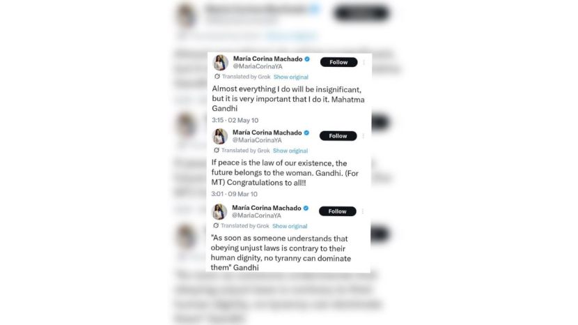 नोबेल विजेत्या मचाडो यांनी मे २०१० मध्ये एक्सवरील एका पोस्टमध्ये, स्पॅनिशमध्ये लिहिले होते की, “तुम्ही जे काही कराल ते क्षुल्लक असेल, परंतु ते करणे खूप महत्त्वाचे आहे. महात्मा गांधी.”