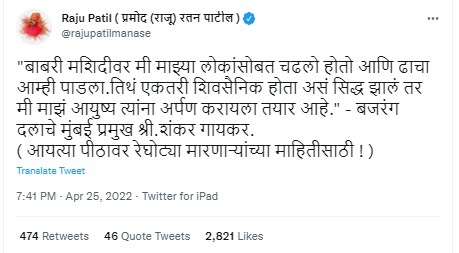 मुख्यमंत्र्यांचं भाषण संपल्यानंतरच सोमवारी सायंकाळी राजू पाटील यांनी ट्विटरवरुन ‘आयत्या पीठावर रेघोट्या मारणाऱ्यांच्या माहितीसाठी’ असं म्हणत एक ट्विट केलंय. बजरंग दलाचे मुंबई प्रमुख शंकर गायकर यांचं एक वक्तव्य शेअर करत बाबरी मशिद पाडण्याच्या वेळी शिवसैनिक उपस्थित नव्हते असा दावा राजू पाटील यांनी केलाय. यामधून त्यांनी शिवसेनेवर अप्रत्यक्षपणे निशाणा साधलाय. “बाबरी मशिदीवर मी माझ्या लोकांसोबत चढलो होतो आणि ढाचा आम्ही पाडला.तिथं एकतरी शिवसैनिक होता असं सिद्ध झालं तर मी माझं आयुष्य त्यांना अर्पण करायला तयार आहे,” असं शंकर गायकर म्हणाले होते, अशी आठवण राजू पाटील यांनी करुन दिलीय.