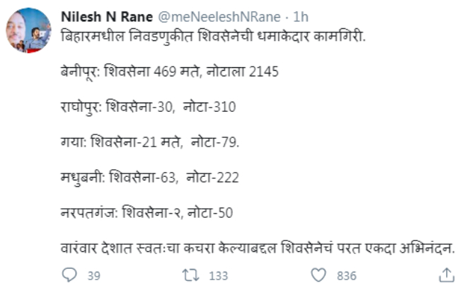 निलेश राणे यांनी सोशल नेटवर्किंगवर व्हायरल होणारी शिवसेनेला मिळालेल्या मतांच्या यादीचा मजकूर पोस्ट करत, “वारंवार देशात स्वतःचा कचरा केल्याबद्दल शिवसेनेचं परत एकदा अभिनंदन,” असं म्हटलं आहे.
