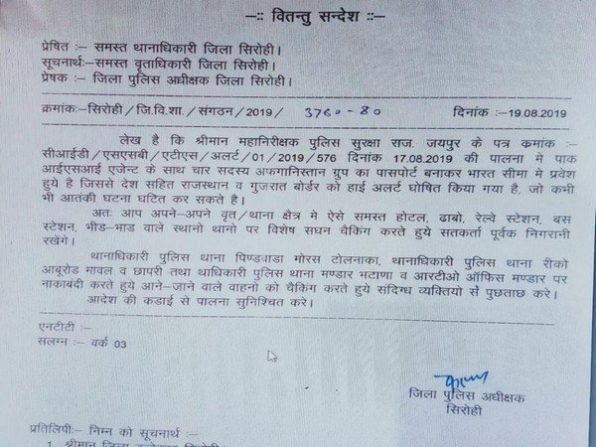 आयएसआयच्या एका एजंटसह चार दहशतवादी भारतीय सीमेत घुसले असल्याचे राजस्थानचे पोलीस अधीक्षक कल्याणमल मीणा यांनी सांगितलं. तसेच कोणत्याही क्षणी ते घातपात घडवू शकतात, असंही त्यांनी नमूद केलं. यासंबंधी एक पत्र जिल्ह्यातील सर्व पोलीस स्थानकांना पाठवण्यात आलं आहे. दरम्यान, पत्र मिळाल्यानंतर पोलीस आणि सुरक्षा यंत्रणा सतर्क झाल्या आहेत. तसेच सर्वाधिक वर्दळीची ठिकाणं, हॉटेल्स, रेल्वे स्थानकं आणि बस स्थानकांमध्ये सखोल तपासणी करण्याचे आदेशही देण्यात आले आहेत. याव्यतिरिक्त संशयित वाहनं आणि संशयित व्यक्तींवरही नजर ठेवण्याचे आदेश दिले आहेत.
