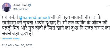 हिराबेन मोदींना श्रद्धांजली अर्पण करताना आम्ही या दु:खद प्रसंगी मोदींसोबत असल्याचं अगदी सर्वपक्षीय नेत्यांनी ट्विटरवरुन म्हटलं आहे. मोदींचे विश्वासू सहकारी असलेल्या अमित शाह यांनी आपल्या भावना ट्विटरवरुन व्यक्त केल्या आहेत. “पंतप्रधान मोदींच्या आई हीराबा यांच्या निधनाची बातमी फारच दु:खदायक आहे. कोणत्याही व्यक्तीच्या आयुष्यामध्ये आई ही पहिली मित्र आणि गुरु असते. तिला गमावण्याचं दु:ख नक्कीच संसारामधील सर्वात मोठं दु:ख असतं,” असं म्हटलं आहे.