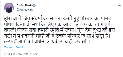 “हीराबा यांनी ज्या पद्धतीने आव्हानांना तोंड देत कुटुंबाचं पालन पोषण केलं ते आदर्श घेण्यासारखं आहे. त्यांचं त्यागपूर्ण आणि तपस्व्यासारखं जीवन नेहमीच आमच्या आठवणींमध्ये कायम राहणार आहे. संपूर्ण देश दु:खाच्या या प्रसंगी पंतप्रधान मोदीजी आणि त्यांच्या कुटुंबियांबरोबर आहे. कोट्यावधी लोकांच्या प्रार्थना तुमच्याबरोबर आहेत,” असं अमित शाह म्हणाले.