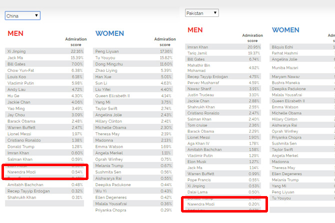 मार्केट रिसर्च आणि डेटा अॅनलिसीस करणाऱ्या ‘योगोव्ह’ कंपनीने जगभरातील जनतेकडून त्यांना आदर्श वाटणारी व्यक्ती कोणती यासंदर्भात मत जाणून घेतले. अमेरिका, युनायटेड किंगड्म, भारताबरोबरच पाकिस्तानमध्येही हे सर्वेक्षण घेण्यात आले. या सर्वेक्षणातून जागतिक स्तरावरील एक आणि देशांतर्गत एक अशा याद्या तयार करण्यात आल्या आहेत. जागतिक स्तरावरील यादीमध्ये मोदींना मागच्या वर्षीपेक्षा दोन स्थानांनी बढती मिळली आहे. मागच्या वर्षी या यादीत आठव्या क्रमांकावर असणारे मोदी यंदा सहाव्या क्रमांकावर आहेत. भारतामधील यादीत मोदी पहिल्या स्थानी असून दुसऱ्या स्थानी महेंद्रसिंह धोनी आहे. विशेष म्हणजे पाकिस्तानला धडा शिकवण्याचा प्रचार करुन निवडूण आलेल्या मोदींची लोकप्रियता पाकिस्तानमध्येही असल्याचे या सर्वेक्षणात दिसून आले. पाकिस्तानी जनतेच्या दृष्टीने आदर्श व्यक्तींच्या यादीमध्ये मोदी २६ व्या स्थानी आहेत. याच यादीमध्ये दहाव्या स्थानी अभिनेता शाहरुख खान, बाराव्या स्थानी सलमान खान तर अमिताभ बच्चन १७ व्या स्थानी आहेत. पाकिस्तानमधील यादीनुसार पाकिस्तान पंतप्रधान इम्रान खान अव्वल स्थानी आहेत. चीनमधील यादीमध्येही मोदी २० व्या स्थानी आहेत.