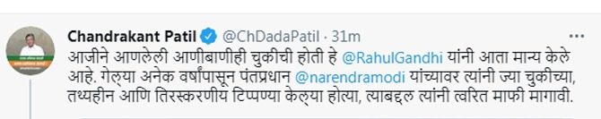 “आजीने आणलेली आणीबाणीही चुकीची होती हे राहुल गांधी यांनी आता मान्य केले आहे. गेल्या अनेक वर्षांपासून पंतप्रधान नरेंद्र मोदी यांच्यावर त्यांनी ज्या चुकीच्या, तथ्यहीन आणि तिरस्करणीय टिप्पण्या केल्या होत्या, त्याबद्दल त्यांनी त्वरित माफी मागावी. नाहीतर काही वर्षानंतर याचीही जाणीव त्यांना होईल आणि मग माफी मागितली जाईल, पण नंतर देशातील जनता त्यांना माफ करणार नाही. राहुल गांधी माफी मागता मागता थकून जातील पण त्यांच्या गुन्ह्यांची मोजणी संपणार नाही.” अशा शब्दांमध्ये चंद्रकांत पाटील यांनी राहुल गांधींवर निशाणा साधला आहे.