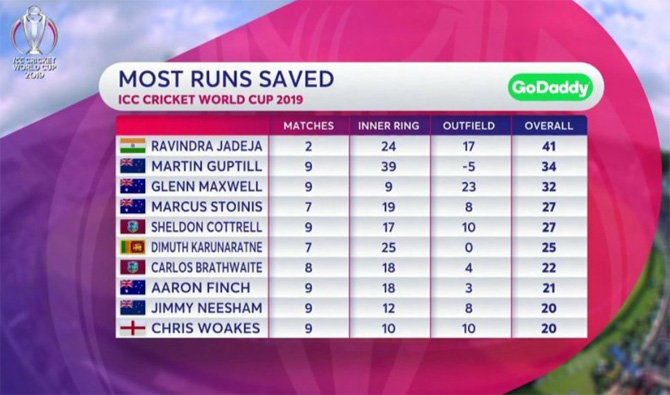 विश्वचषक स्पर्धेमध्ये सर्वाधिक धावा रोखणाऱ्या क्षेत्ररक्षकांच्या यादीमध्ये जाडेजाने अव्वल क्रमांक पटकावला आहे. विशेष म्हणजे या यादीमधील इतर खेळाडू नऊ ते सात सामने खेळून या यादीमध्ये विराजमान झालेले असताना जाडेजाने अवघ्या दोन सामन्यांमध्ये अव्वल स्थान मिळवले आहे. दोन सामन्यांमध्ये जाडेजाने आतील सर्कलमध्ये २४ धावा वाचवल्या आहेत तर बाहेरील सर्कमध्ये म्हणजेच आऊट फिल्डमध्ये १७ धावा वाचवल्या आहेत. जाडेजाने एकूण ४१ धावा वाचवल्या असून तो सर्वाधिक धावा वाचवणारा खेळाडू ठरला आहे. जाडेजा खालोखाल या यादीमध्ये दुसऱ्या स्थानावर ३४ धावांसहीत न्यूझीलंडचा मार्टिन गप्टिल, तिसऱ्या स्थानावर ३२ धावांसहीत ऑस्ट्रेलियाचा ग्लेन मॅक्सवेल, चौथ्या स्थानावर ऑस्ट्रेलियाचाच मार्कस स्टॉनिस (२७ धावा) तर पाचव्या स्थानी वेस्ट इंडिजचा शेल्डन कॉट्रील (२७ धावा) यांचा समावेश आहे. सर्वाधिक धावा वाचवणाऱ्या खेळाडूंच्या यादीमध्ये साखळी सामन्यातील भारताच्या शेवटच्या साखळी सामन्यापर्यंत एकाही खेळाडूचा समावेश नव्हता. मात्र साखळी फेरीतील श्रीलंकेविरुद्धचा सामना आणि उपांत्य फेरीतील न्यूझीलंडविरुद्धचा सामना जाडेजा खेळला आणि तो या यादीत थेट पहिल्या क्रमांकावर आला.