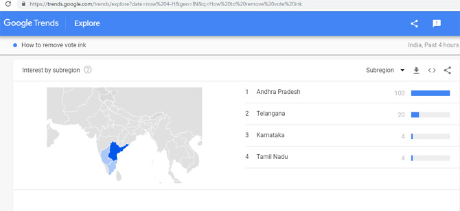 बोटांवरील शाई कशी काढावी यासंदर्भात सर्च करणाऱ्या राज्यांमध्ये दक्षिणेतील राज्ये आघाडीवर असल्याचे चित्र दिसत आहे. आंध्रप्रदेश, तेलंगण, कर्नाटक, तामिळनाडू या राज्यांमध्ये शाई काढण्यासंदर्भात गुगल सर्च करणाऱ्यांचे प्रमाण सर्वाधिक आहे.