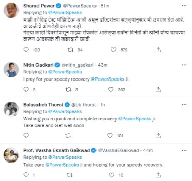केंद्रीय मंत्री नितीन गडकरी यांनी पवारांच्या ट्विटवर रिप्लाय करुन. “तुम्ही यामधून लवकर बरे व्हावं यासाठी मी प्रार्थना करतो, शरद पवारजी,” असा रिप्लाय नितीन गडकरींनी केलाय. तर काँग्रेसचे नेते बाळासाहेब थोरात यांनी, “तुम्हाला लवकर बरं वाटावं आणि यामधून तुम्ही पूर्णपणे बरं व्हावं यासाठी शुभेच्छा. काळजी घ्या आणि लवकर बरे व्हा,” असं बाळासाहेब थोरात म्हणालेत. तर राज्याच्या शिक्षणमंत्री वर्षा गायकवाड यांनी, “शरद पवारजी काळजी घ्या. तुम्हाला लवकर बरं वाटावं अशी इच्छा व्यक्त करते,” असं वर्षा पवार म्हणाल्यात.