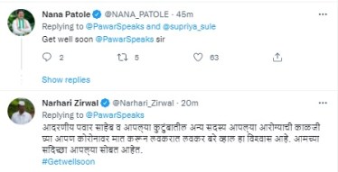 काँग्रेसचे महाराष्ट्रातील प्रदेशाध्यक्ष नाना पटोले यांनी, ‘गेट वेल सून शरद पवार सर,’ असा रिप्लाय केलाय. तर राष्ट्रवादी काँग्रेसचे आमदार आणि विधानसभेचे उपाध्यक्ष नरहरी झिरवळ “आदरणीय पवार साहेब व आपल्या कुटुंबातील अन्य सदस्य आपल्या आरोग्याची काळजी घ्या आपण कोरोनावर मात करून लवकरात लवकर बरे व्हाल हा विश्वास आहे. आमच्या सदिच्छा आपल्या सोबत आहेत,” असं म्हटलंय.