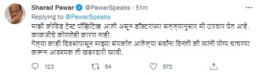 शरद पवार काय म्हणाले…”माझी करोना चाचणी पॉझिटिव्ह आली आहे. पण काळजीचं काही कारण नाही. मी डॉक्टरांच्या सल्ल्याने उपचार घेत आहे. मी माझ्या संपर्कात आलेल्या सर्वांना विनंती करतो की त्यांनी स्वतःची चाचणी करून घ्यावी आणि खबरदारी घ्यावी,” असं पवार यांनी २४ जानेवारी २०२२ रोजी दुपारी दोन वाजून पाच मिनिटांनी केलेल्या ट्विटमध्ये म्हटलं आहे.