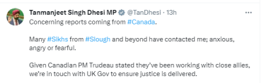 दरम्यान, या सर्व प्रकरणाचे पडसाद ब्रिटनच्या संसदेत उमटताना पाहायला मिळत आहेत. ब्रिटनच्या संसदेतील लेबर पार्टीचे शीख खासदार तन्मनजीत सिंग धेसी यांनी या प्रकरणावर चिंता व्यक्त केली आहे. “कॅनडामधून येत असलेल्या बातम्या चिंताजनक आहेत. ब्रिटनमधील व विदेशातीलही अनेक शीख समुदायाच्या लोकांचे आम्हाला फोन येत आहेत. हे लोक संभ्रमित, संतप्त व घाबरलेले आहेत. कॅनडाच्या पंतप्रधानांनी त्यांच्या मित्रदेशांच्या मदतीने काम करत असल्याचं सांगितलं आहे. त्यामुळे आम्हीही ब्रिटनच्या सरकारच्या संपर्कात असून कॅनडातील या प्रकरणात न्याय होईल यासाठी प्रयत्न करू”, असं धेसी म्हणाले.