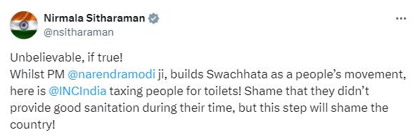 दरम्यान, काँग्रेस सरकारच्या या निर्णयामुळे राज्यातील विरोधी पक्षांनी टीका केली आहे. केंद्रीय अर्थमंत्री निर्मला सीतारमण यांनीही एक्सवर पोस्ट करून टीका केली आहे. “पंतप्रधान नरेंद्र मोदी यांनी स्वच्छता ही लोकचळवळ बनवली.परंतु, आता काँग्रेस सरकार शौचालयासाठी लोकांवर कर लावत आहे. त्यांनी त्यांच्या काळात चांगली स्वच्छता केली नाही याची लाज वाटते, पण हे पाऊल देशाला लाजवेल!”, असं निर्मला सीतारमण म्हणाल्या.