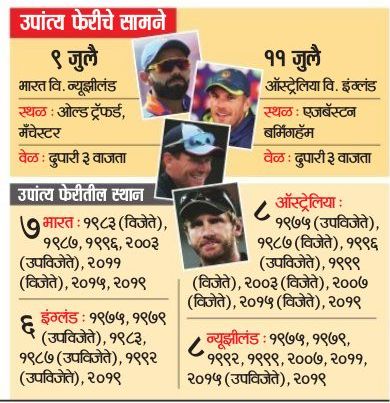क्रिकेटचा विश्वचषक आता अखेरच्या टप्प्यात आला असून केवळ भारत, ऑस्ट्रेलिया, इंग्लंड आणि न्यूझीलंड हे चारच संघ विश्वचषकाच्या शर्यतीमध्ये शिल्लक राहिलेत. भारत विरुद्ध न्यूझीलंड हा उपांत्य फेरीतील पहिला सामना आज मॅंचेस्टरच्या ओल्ड ट्रॅफर्ड मैदानावर रंगणार आहे, तर 11 जुलै रोजी इंग्लंड विरुद्ध ऑस्ट्रेलिया हा दुसरा सामना होईल. दोन्ही सामन्यातील विजेत्यांमध्ये 14 जुलै रोजी अंतिम सामना पार पडेल. त्यापूर्वी उपांत्य फेरीमध्ये कोण जिंकणार आणि अंतिम सामना कोण गाठणार याबाबत मोठ्या प्रमाणात चर्चा सुरू आहे. त्यामुळे आज जाणून घेऊयात क्रिकेट विश्वचषकाच्या इतिहासात सर्वाधिक वेळेस उपांत्य फेरीत विजय मिळवणाऱ्या आणि एकदाही उपांत्य फेरीत पराभवाचा सामना न करावा लागलेल्या संघाबद्दल.