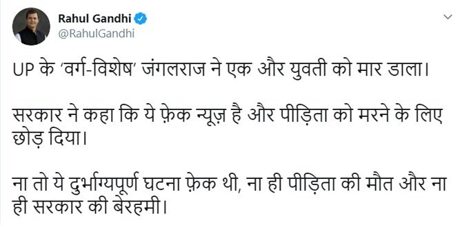 “उत्तर प्रदेशच्या ‘वर्ग-विशेष’ जंगलराजने आणखी एका तरूणीला मारून टाकले. सरकारने म्हटले की फेक न्यूज आहे आणि पीडितेस मरण्यासाठी सोडून दिले. मात्र ही दुर्देवी घटना खोटी नव्हती, पीडितेचा मृत्यूही आणि सरकारचा निर्दयीपणा देखील खोटा नव्हता.” असे राहुल गांधी यांनी ट्विट केले आहे.