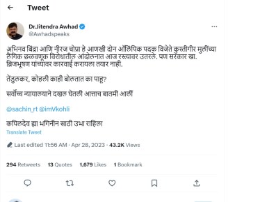 भारतीय महिला कुस्तीपटूंनी कुस्ती महासंघाचे अध्यक्ष ब्रिजभूषण सिंह यांच्याविरोधात लैंगिक शोषणाचे गंभीर आरोप केले आहेत. ब्रिजभूषण सिंह यांच्याविरोधात या प्रकरणी गुन्हा दाखल करण्यात यावा, या मागणीसाठी अनेक महिला कुस्तीपटू तीन महिन्यांपूर्वी दिल्लीत धरणे आंदोलनाला बसल्या होत्या. या प्रकरणात आता राष्ट्रवादीचे काँग्रेसचे नेते जितेंद्र आव्हाड यांनी उडी घेतली आहे. त्यांनी एक ट्वीट करत थेट सचिन तेंडुलकर आणि विराट कोहलीला प्रश्न केला आहे.