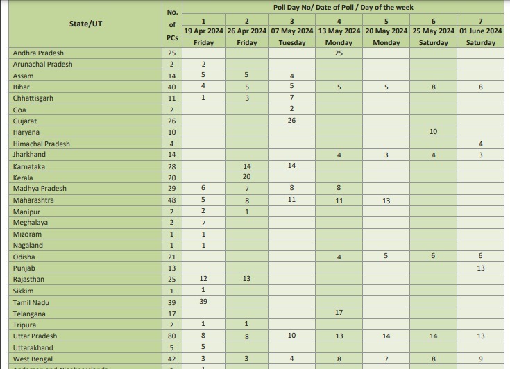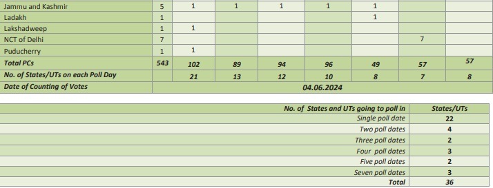 कर्नाटक, राजस्थान, त्रिपुरा, मणिपूर या राज्यांमध्ये दोन टप्प्यांत मतदान होईल. तर, छत्तीसगड, आसाममध्ये तीन टप्प्यांत मतदान होईल. ओडिशा, मध्य प्रदेश, झारखंड या राज्यांमध्ये चार टप्प्यात मतदान होणार असून महाराष्ट्र, जम्मू आणि काश्मीरमध्ये पाच टप्प्यात मतदान होईल. तसंच, उत्तर प्रदेश, बिहार आणि पश्चिम बंगालमध्ये सात टप्प्यांत मतदान होणार आहे.