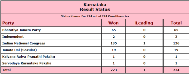 कर्नाटक विधानसभेच्या २२४ पैकी १३५ जागांवर काँग्रेस पक्ष विजयी ठरला असून काँग्रेसने बहुमताचा आकडा पार केला आहे. तर सत्ताधारी भाजपाला केवळ ६५ जागांवर समाधान मानावं लागलं आहे. जनता दल (सेक्युलर) पक्षालाही साजेशी कामगिरी करता आली नाही. २०१८ विधानसभा निवडणुकीच्या तुलनेत जेडीएसची मोठ्या प्रमाणात पडझड झाली आहे. जेडीएसला केवळ १९ जागा जिंकता आल्या.