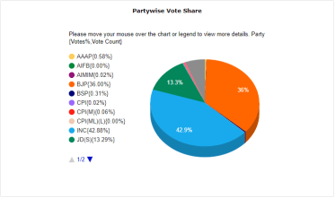 निवडणूक आयोगाच्या ताज्या आकडेवारीनुसार, अद्याप एका जागेवरचा निकाल घोषित झाला नाही. या जागेवर काँग्रेस आघाडीवर आहे. या निवडणुकीत काँग्रेसला ४२.९ टक्के मतं मिळाली आहेत. तर भाजपाला ३६ टक्के मतं मिळाली आहेत. जनता दल (धर्मनिरपेक्ष) पक्षाच्या मतांच्या टक्केवारीत घट झाली असून या पक्षाला १३.३ टक्के मतं मिळाली आहेत.