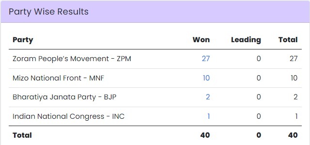 विशेष म्हणजे मिझोराममध्ये झोरम पीपल्स मूव्हमेंट, मिझो नॅशनल फ्रन्ट आणि काँग्रेस पक्षात त्रिशंकू लढत होण्याची अपेक्षा होती. पण या निवडणुकीत काँग्रेस पक्षाला सपशेल अपयश आलं आहे. २०१८ मधील खराब कामगिरीनंतर काँग्रेस पुनरागमन करण्याची आशा होती. मिझोराममध्ये तुलनेनं कमी राजकीय ताकद असलेल्या भाजपाने दोन जागा जिंकल्या आहेत.
