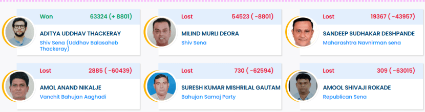 आदित्य ठाकरे यांना ६३ हजार ३२४ मते मिळाली असून मिलिंद देवरा दुसऱ्या क्रमांकावर आहेत. त्यांना ५४ हजार ५२३ मते मिळाली असून मनसेचे संदीप देशपांडे यांना १९ हजार ३६७ मते मिळाली आहेत.