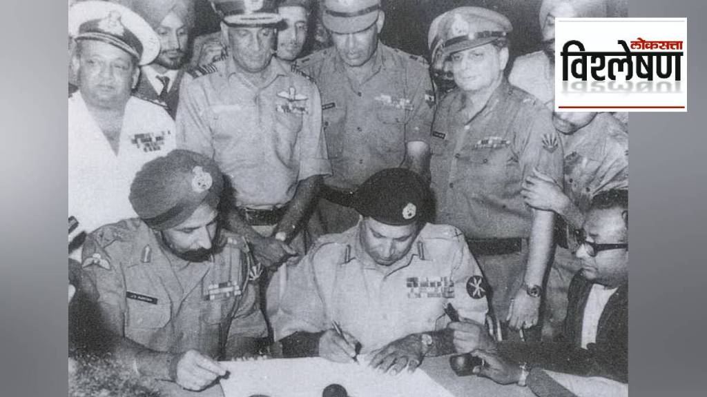 भारत पाकिस्तानचे १९७१चे युद्ध सर्वार्थाने ऐतिहासिक. या युद्धाला सोमवारी (१६ डिसेंबर) ५३ वर्षे पूर्ण झाली. तीनच वर्षांपूर्वी युद्धाला ५० वर्षे पूर्ण झाल्यानिमित्त देशभर स्वर्णिम विजय दिन साजरा करण्यात आला. पराक्रमाचे पोवाडे गायले गेले. शौर्यकथा सांगितल्या गेल्या. १९७१ चे युद्ध लढलेल्या योद्ध्यांचा मुलाखती प्रसिद्ध झाल्या. या युद्धाच्या स्मृती यंदाही जागविल्या जात असताना, दिल्लीतील लष्कराच्या मुख्यालयातील लष्करप्रमुखांच्या कार्यालयातील पाकिस्तान शरणागती स्वीकारतानाच्या ऐतिहासिक क्षण दाखविणारे चित्र हटविण्यात आले आहे. सामाजिक माध्यमांसह निवृत्त लष्करी अधिकाऱ्यांमध्येही यावरून चर्चा होत आहेत. याविषयी…