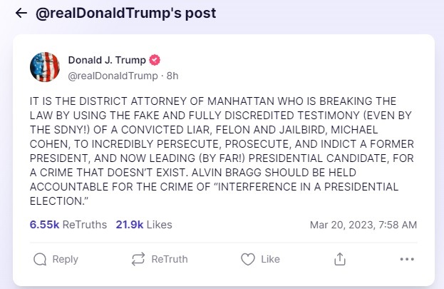 अमेरिकेचे माजी राष्ट्राध्यक्ष डोनाल्ड ट्रम्प यांच्यावर कायदेशीर कारवाई होण्याची शक्यता आहे. २०१६ साली राष्ट्राध्यक्ष निवडणुकीच्या प्रचारादरम्यान पॉर्नस्टार स्टॉर्मी डॅनियलला तोंड बंद ठेवण्यासाठी त्यांनी पैसे दिले, असा आरोप त्यांच्यावर करण्यात येत आहे. डोनाल्ड ट्रम्प यांनी स्वतःच्या ट्रूथ सोशल या साईटवर एक पोस्ट टाकून स्वतःच याची माहिती दिली. ट्विटरवरील खाते बंद करण्यात आल्यानंतर ट्रम्प यांनी या सोशल मीडिया साईटची सुरुवात केली होती. या साईटवर एक पोस्ट टाकून ट्रम्प यांनी त्यांना मंगळवार, दि. २१ मार्च २०२३ रोजी अटक होणार असल्याचे लिहिले आहे. तसेच आपल्या समर्थकांनी आंदोलनासाठी एकत्र यावे, असे आवाहनही त्यांनी केले आहे.