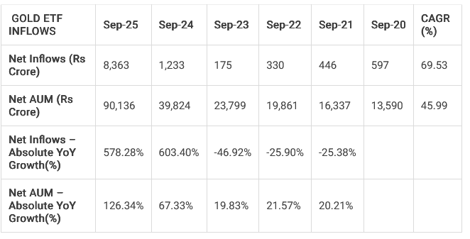 भारतीय म्युच्युअल फंड संघटनेने (AMFI) जारी केलेल्या ताज्या आकडेवारीनुसार, गोल्ड ETF मधील गुंतवणूक २०२५ च्या सप्टेंबर महिन्यात तब्बल ५७८.२८ टक्क्यांनी म्हणजेच सुमारे सहापट वाढून ₹८,३६३.१३ कोटींवर पोहोचली आहे, हा दर मागील वर्षी याच कालावधीत केवळ ₹१,२३२.९९ कोटी होता.