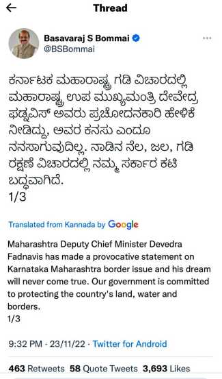 बोम्मई यांनी त्यांच्या अन्य एका ट्वीटमध्ये महाराष्ट्राचे उपमुख्यमंत्री देवेंद्र फडणवीस यांच्यावर महाराष्ट्र-कर्नाटक सीमावादावर प्रक्षोभक वक्तव्य केल्याचा आरोप केला होता. तसेच त्यांचं स्वप्न कधीही पूर्ण होणार नाही असं म्हटलं होतं. आमचं सरकार देशाची जमीन, पाणी आणि सीमेचं रक्षण करण्यासाठी कटिबद्ध आहे, असंही त्यांनी या ट्वीटमध्ये नमूद केलं होतं.