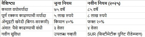 - जुना नियम: ₹५ लाखांपेक्षा जास्त निधी असल्यास किमान ४०% रक्कम अॅन्युइटीसाठी बंधनकारक होती.