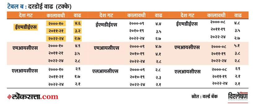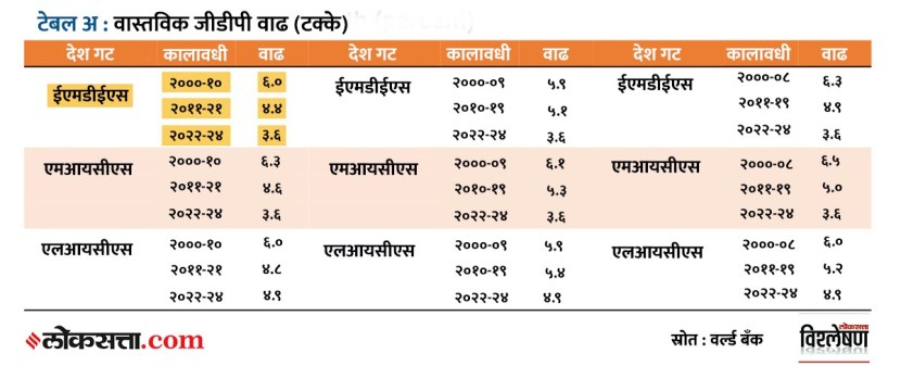 खालील दोन तक्त्यांमध्ये (A आणि B) वास्तविक GDP वाढ आणि दरडोई GDP वाढीचा डेटा पाहा. गेल्या दोन दशकांमध्ये उदयोन्मुख बाजारपेठ आणि विकसनशील अर्थव्यवस्थांच्या ( EMDEs) किंवा मध्यम-उत्पन्न देश (MICs) किंवा कमी-उत्पन्न देश (LICs) च्या मालकीचे असले तरीही व्यापक आधारित घट दर्शवते. जागतिक बँकेने आर्थिक वृद्धी निश्चित करणाऱ्या मूलभूत घटकांच्या संपूर्ण संचावर लक्ष केंद्रित केले असून, ते सर्व शक्ती गमावत आहेत.