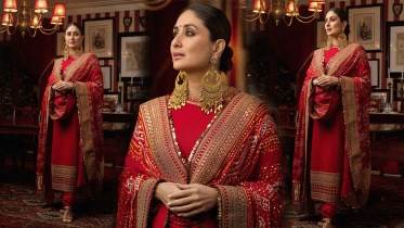 साडीसोबतच पारंपरिक सूटही सणासाठी उत्तम पर्याय ठरतो. करिना कपूर खानने लाल रंगाचा सूट परिधान केला आहे, ज्यासोबत बांधणीचा दुपट्टा आहे, जो एक रिच लूक देतो.
