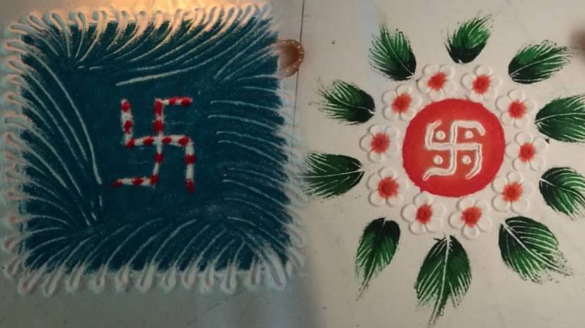 २. मधोमध स्वस्तिक आणि त्याच्या भोवती पाने, फुले किंवा आणखी तुमच्या आवडीच्या डिझाईन काढून तुम्ही अगदी साधी रांगोळी देखील काढू शकता.