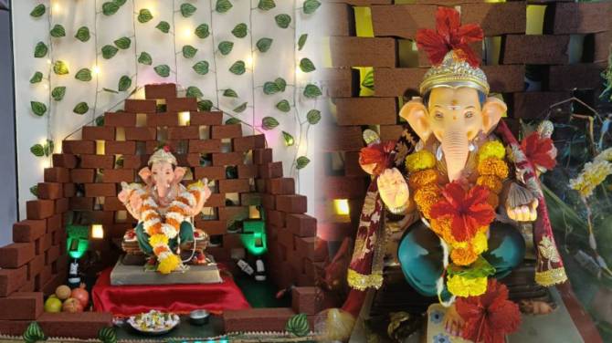 बाजारातून फोम विकत आणा. विटांच्या आकारात फोम कापून घ्या. नंतर फोमला विटांचा रंग देण्यासाठी गेरू पाण्यात रात्रभर भिजवून ठेवा. दुसऱ्या दिवशी विटांना रंग देण्यास सुरुवात करा. शक्यतो एकाच दिवशी विटांना रंग करून घ्या आणि रात्रभर त्यांना तसंच ठेवून द्या . जिथे गेरू बसणार नाही तिथे तुम्ही ऍक्रेलिक वॉटर कलरचा उपयोग करून फिनिशिंग करू शकता. बाजारातून नकली पानांची माळ घेऊन या. त्यानंतर भिंतीवर एक प्लेन रंगाचे कापड लावून घ्या. दोऱ्याच्या साहाय्याने नकली पाने शिवून कापडावर लावून घ्या. त्यानंतर विटा तयार झाल्या की टूथपिक व टाचण्यांच्या मदतीने या विट्या क्रमाने लावून घ्या. अशाप्रकारे तुमचे विटांचे डेकोरेशन ( Ganpati Decoration) तयार.