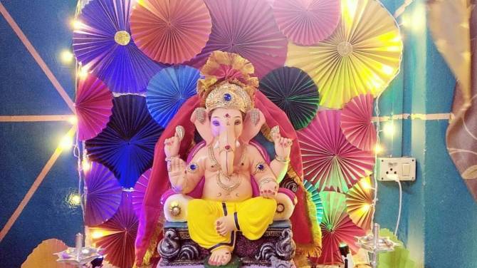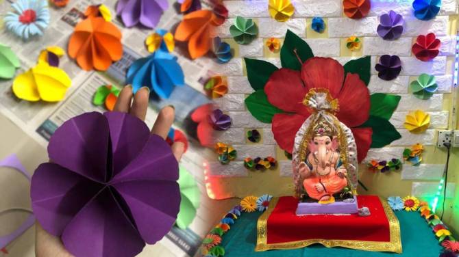 रंगीबेरंगी पंखे बनवण्यासाठी तुमच्या आवडीच्या रंगांचे कार्ड पेपर खरेदी करा. प्रत्येक कार्ड पेपरला छोट्या किंवा मोठ्या आकारात आयताकृती आकारात कापून घ्या. आपण शाळेत पंखा बनवायचो त्याप्रमाणे प्रत्येक कागद एकदा सरळ आणि एकदा उलट्या दिशेने घडी घालण्यास सुरुवात करा. असे दोन सारख्या रंगाचे पंखे तयार झाले की, एका पंख्याचे शेवटचे आणि दुसऱ्या पंख्याचे सुरवातीचे टोक तर नंतर एका पंख्याचे सुरवातीचे व दुसऱ्या पंख्याचे शेवटचे टोक चिटकवून घ्या आणि स्टॅप्लर सुद्धा लावा. अशाप्रकारे तुमचा एक वर्तुळाकार आकाराचा एक मोठा पंखा तयार होईल. अशापद्धतीने तुम्ही रंगीबेरंगी पंखे तयार करून घ्या. त्यानंतर एक मोठा पुठ्ठा घेऊन त्यावर हे सगळे पंखे टाचण्यांच्या साहाय्याने लावून घ्या. फळीच्या साहाय्याने हा पुठ्ठा उभा करा आणि भिंतीला खिळ्यांच्या मदतीने लावून घ्या. अशाप्रकारे तुमचे डेकोरेशन (Ganpati Decoration) तयार.