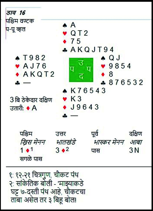 एवढय़ात मेनन बंधू आणि भातखंडे खेळायला हजर झाले. डाव वाटून ख्रिस मेनननं १ चौकट बोली दिली. त्याच्या पद्धतीप्रमाणे त्याचा अर्थ १२ वर चित्रगुण आणि लांब चौकट पंथ असा होता. भातखंडेकडे ७ पानी घट्ट किलवर पंथ आणि इस्पिक एक्का असे नगद ८ दस्त होते. आबांकडे चौकट पंथात थोडी अडगळ आणि १-२ चित्रं असती तर ३ बिहूचा शतकी ठेका जमण्यासारखा होता, पण हे ब्रिजच्या बोलींमधून कसं सुचवायचं हा प्रश्न होता. सुदैवाने भातखंडेने काही ब्रिजच्या पुस्तकांचा अभ्यास करून सांकेतिक बोलींची माहिती करून घेतली होती. त्यातील ३ चौकट ही वरबोली १ चौकटच्या बोलीवर केली असता नेमका असाच हात भिडूला दाखवते, हे भातखंडेने सगळ्यांना शिकवलं होतं. त्याप्रमाणे त्याने ३ चौकट बोली दिली. आबांकडे इस्पिक-बदाम राजा आणि चौकटची ५ पानं होती. त्यामुळे त्यांनी ३ बिहू बोली दिली आणि ठेका पक्का झाला.