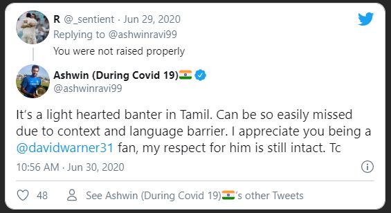वॉर्नरची मस्करी एका चाहत्याला मात्र अजिबात रूचली नाही. त्याने अश्विनच्या संस्कारांवरूनच प्रश्न विचारला. तुला लहानाचा मोठा करताना तुझ्यावर योग्य संस्कार करण्यात आले नाहीत, अशी टीका त्या चाहत्याने केली. त्याच्यावर अश्विनने त्याला शांतपणे स्पष्टीकरण दिले. “मित्रा, वॉर्नरची मस्करी हा मजेचा भाग होता. भाषेच्या समस्येमुळे कदाचित तुला माझं म्हणणं कळलं नसेल. वॉर्नरचा चाहता असल्याने तू माझ्यावर टीका केलीस, पण मीदेखील वॉर्नरचा तुझ्याइतकाच मोठा चाहता आहे”, असे अश्विनने स्पष्ट केलं.