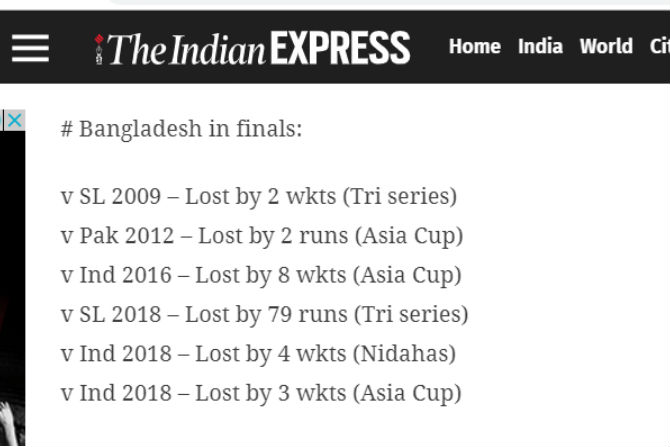 आजच्या पराभवामुळे आयसीसीच्या मोठ्या स्पर्धांमध्ये किंवा तिरंगी मालिकेत अंतिम सामन्यात पोहोचल्यानंतर पराभूत होण्याची परंपरा बांगलादेशने कायम राखली आहे. २००९ साली बांगलादेश आणि श्रीलंका यांच्यात तिरंगी मालिकेची अंतिम फेरी रंगली होती. यात बांगलादेशला २ गडी राखून श्रीलंकेने पराभूत केले होते. त्यानंतर आशिया चषकाच्या अंतिम सामन्यात बांगलादेशला २०१२ साली पाकिस्तानने तर २०१६ साली भारताने धूळ चारली होती. त्यानंतर २०१८ मध्ये झालेल्या तिरंगी मालिकेत श्रीलंकेने पुन्हा एकदा बांगलादेशला पराभूत केले आणि स्पर्धेचे विजेतेपद पटकावले. आणि अखेर २०१८ मध्ये निदाहास तिरंगी मालिकेत भारताने ४ गडी राखून तर आशिया चषकात ३ गडी राखून बांगलादेशचा पराभव केला.