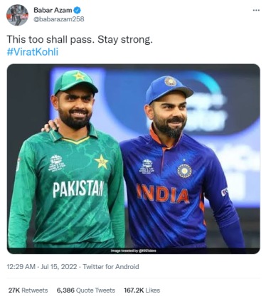 विराट बाद झाल्यानंतर अवघ्या काही मिनिटांमध्ये एकदिवसीय क्रिकेटच्या जागतिक क्रमवारीमध्ये अव्वल स्थानी असणाऱ्या बाबर आझमने विराटसोबतचा फोटो ट्विटरवरुन पोस्ट केला. टी-२० विश्वचषकाच्या सामन्यादरम्यानच्या या फोटोमध्ये कोहली आणि बाबर आझम एकत्र चालताना दिसत आहेत. या फोटोला बाबारने एक सुंदर कॅप्शन दिली आहे. विराटला पाठिंबा देण्यासाठी बाबरने, “हा वेळही निघून जाईल. खंबीर राहा,” असा संदेश या फोटोसोबत विराटला दिलाय. त्याने विराटच्या नावाचा हॅशटॅगही वापरला आहे.