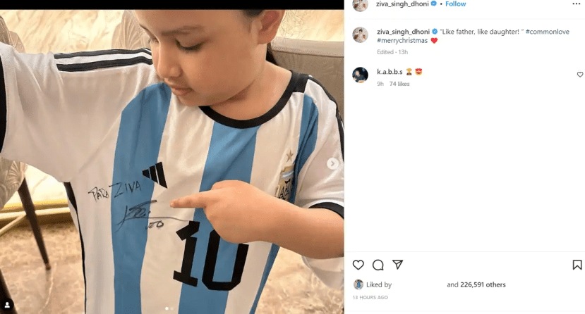 काही दिवसांपूर्वीच माजी क्रिकेटपटूने प्रग्यान ओझाने केलेल्या पोस्टमध्ये मेसीने भारतीय क्रिकेट नियामक मंडळाचे अध्यक्ष जय शाह यांच्यासाठी ऑटोग्राफ केलेली एक खास जर्सी पाठवल्याचं म्हटलं होतं. आता अशाच प्रकारची जर्सी मेसीने धोनीच्या मुलीसाठी म्हणजे जीवासाठी पाठवली आहे. जीवाच्या इन्स्ताग्राम अकाऊंटवरुन या जर्सीचा फोटो शेअर करण्यात आला आहे. यामध्ये मेसीने पाठवलेली जर्सी दिसत असून त्याचा ऑटोग्राफ म्हणजेच स्वाक्षरीही दिसत आहे.