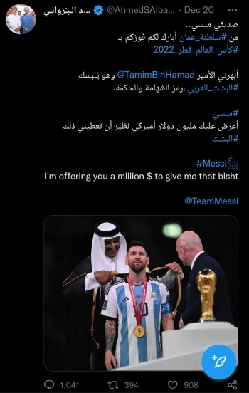 “मेसी माझ्या मित्रा, मी तुला विश्वचषक जिंकल्याबद्दल शुभेच्छा देतो. कतारच्या राजांनी तुझ्या अंगावर बिश्त घातल्याने मला अभिमान वाटला. हे बिश्त म्हणजे मोठा पराक्रम केल्याचं, दृरदृष्टी असल्याचं निशाण असून ते तुझ्या खांद्यावर शोधून दिसत होतं,” असं बरवानी यांनी ट्वीट केलं आहे. तसेच याच ट्वीटमध्ये त्यांनी, “तू मला ते बिश्त ते मी त्या मोबदल्यात एक मिलियन डॉलर्स देईल,” असंही बरवानी यांनी म्हटलं आहे.