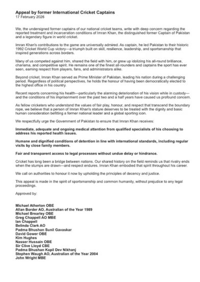 १७ फेब्रुवारी रोजी माजी कर्णधारांनी एक संयुक्त निवेदन जाहीर केले आहे. ज्यात इम्रान खान यांच्याबद्दल काळजी व्यक्त करण्यात आली. जवळपास अडीच वर्षांपासून इम्रान खान कारागृहात आहेत. या निवेदनावर कपिल देव, सुनील गावसकर यांच्यासह मायकेल आथर्टन, अॅलन बॉर्डर, मायकेल ब्रेअरली, ग्रेग चॅपेल, इयान चॅपेल, बेलिंडा क्लार्क, डेव्हिड गॉवर, किम ह्यूजेस, नासेर हुसेन, क्लाइव्ह लॉयड, स्टीफन वॉ आणि जॉन राईट यांच्या स्वाक्षऱ्या आहेत.