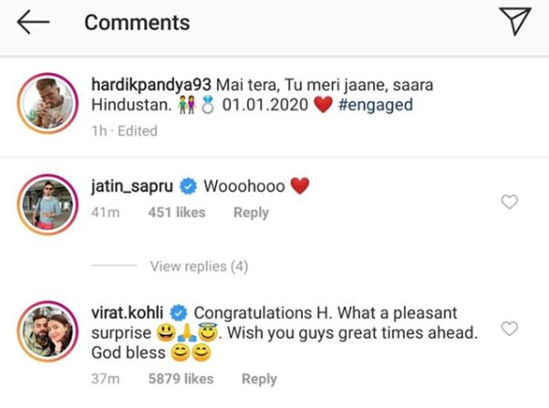 हार्दिकच्या साखरपुड्याची ही बातमी वाऱ्याच्या वेगाने पसरली. त्याच्यावर चाहत्यांकडून शुभेच्छांचा वर्षाव झाला. क्रिकेट विश्वातूनच नव्हे तर इतर क्षेत्रांतूनही हार्दिकवर अभिनंदनाचा वर्षाव झाला. यात कर्णधार विराट कोहली याच्या स्पेशल शुभेच्छा खास चर्चेत राहिल्या. “H, तुझं अभिनंदन. ही बातमी खरंच खुप आनंदादायी सर्प्राईझसारखी आहे. तुम्हां दोघांना पुढील वाटचालीसाठी खूप खूप शुभेच्छा”, अशा शब्दात विराटने त्याला शुभेच्छा दिल्या.