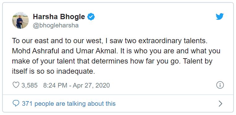 उमर अकमलवर कारवाईचा बडगा उगारल्यानंतर विविध स्तरातून प्रतिक्रिया उमटू लागल्या. त्यात प्रसिद्ध समालोचक हर्षा भोगले यांनीही आपले मत व्यक्त केले. “मी पूर्वेपासून पश्चिमेपर्यंत मी दोन अतिशय प्रतिभावान खेळाडू पाहिले. एक बांगलादेशचा मोहम्मद अशरफुल आणि दुसरा उमर अकमल. पण तुम्ही कोण आहात आणि तुम्ही तुमच्या प्रतिभेचा कशाप्रकारे वापर करता यावर तुमची कारकीर्द ठरते” असे स्पष्ट मत त्यांनी मांडले.