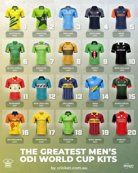ODI World Cup Jersey: क्रिकेट विश्वचषक १९७५ मध्ये जरी सुरू झाला असला तरी बॅट-बॉलच्या या खेळाला खरा रंग १९९२ मध्ये आला. हे वर्ष होते जेव्हा पहिल्यांदा रंगीत कपड्यांमध्ये विश्वचषक खेळला गेला होता. पहिल्या तीन आवृत्त्यांमध्ये पांढरे कपडे परिधान केलेले खेळाडू यावेळी रंगीत जर्सीमध्ये दिसले. त्यामुळे एकदिवसीय क्रिकेट अधिक उजळले. आता २०२३च्या विश्वचषकासाठी भारतीय संघाची जर्सीही लाँच करण्यात आली आहे. गेल्या ३१ वर्षात खेळलेल्या सात विश्वचषकांमध्ये भारतीय संघाने वेगवगळ्या प्रकारची जर्सी घातली होती. दरम्यान ऑस्ट्रेलियन क्रिकेटने आतपर्यंतच्या वर्ल्डकपमधील सर्व संघाच्या सर्वोतम २० जर्सींची निवड केली आहे. त्यात भारताच्या दोन वर्ल्डकप जर्सींना स्थान मिळाले.