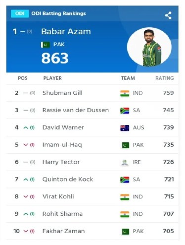 अव्वल स्थानावर असलेल्या बाबर आझमचे ८६३ गुण आहेत, तर गिल ७५९ रेटिंगसह १०३ गुणांनी मागे आहे. शुबमन व्यतिरिक्त, विराट कोहली आणि रोहित शर्मा यांनाही प्रत्येकी दोन स्थानांचा फायदा झाला आहे. दोन्ही दिग्गज पहिल्या १० फलंदाजांमध्ये सामील झाले आहेत. कोहली ८व्या आणि रोहित ९व्या स्थानावर आहे. तब्बल साडेचार वर्षांनंतर प्रथमच भारताच्या तीन फलंदाजांना आयसीसी क्रमवारीत पहिल्या दहामध्ये स्थान मिळवण्यात यश आले आहे. यापूर्वी जानेवारी २०१९ मध्ये भारताचा शिखर धवन, रोहित शर्मा आणि विराट कोहली पहिल्या १० मध्ये होते. भारताबरोबरचं सध्या अव्वल १० फलंदाजांमध्ये पाकिस्तानचेही तीन खेळाडू आहेत. त्यात इमाम-उल-हक एका स्थानाने घसरण होऊन तो ५व्या स्थानावर तर फखर जमान तीन स्थानांनी घसरून १०व्या स्थानावर आला आहे.