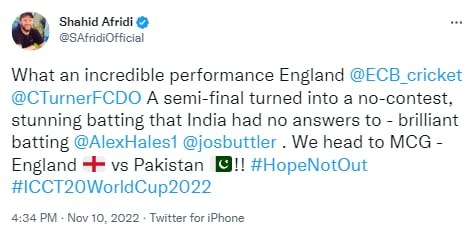 “इंग्लंडच्या संघाने काय उत्तम कामगिरी केली आहे. हा उपांत्य फेरीचा सामना म्हणजे काही आव्हान नसणारा ठरला. इंग्लंडच्या फलंदाजीसाठी भारताकडे कोणतंही उत्तर नव्हतं. अॅलेक्स हेल्स आणि जॉस बटलरने भन्नाट फलंदाजी केली,” असं आफ्रिदीने म्हटलं आहे. याच ट्वीटमध्ये त्याने, “आता लक्ष मेलबर्न क्रिकेट मैदानावरील इंग्लंड विरुद्ध पाकिस्तान सामन्याकडे आहे,” असंही आफ्रिदी म्हणाला आहे.