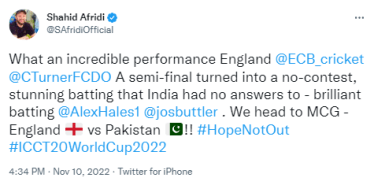 “इंग्लंडच्या संघाने काय उत्तम कामगिरी केली आहे. हा उपांत्य फेरीचा सामना म्हणजे काही आव्हान नसणारा ठरला. इंग्लंडच्या फलंदाजीसाठी भारताकडे कोणतंही उत्तर नव्हतं. अॅलेक्स हेल्स आणि जॉस बटलरने भन्नाट फलंदाजी केली,” असं आफ्रिदीने म्हटलं आहे. याच ट्वीटमध्ये त्याने, “आता लक्ष मेलबर्न क्रिकेट मैदानावरील इंग्लंड विरुद्ध पाकिस्तान सामन्याकडे आहे,” असंही आफ्रिदी म्हणाला आहे.